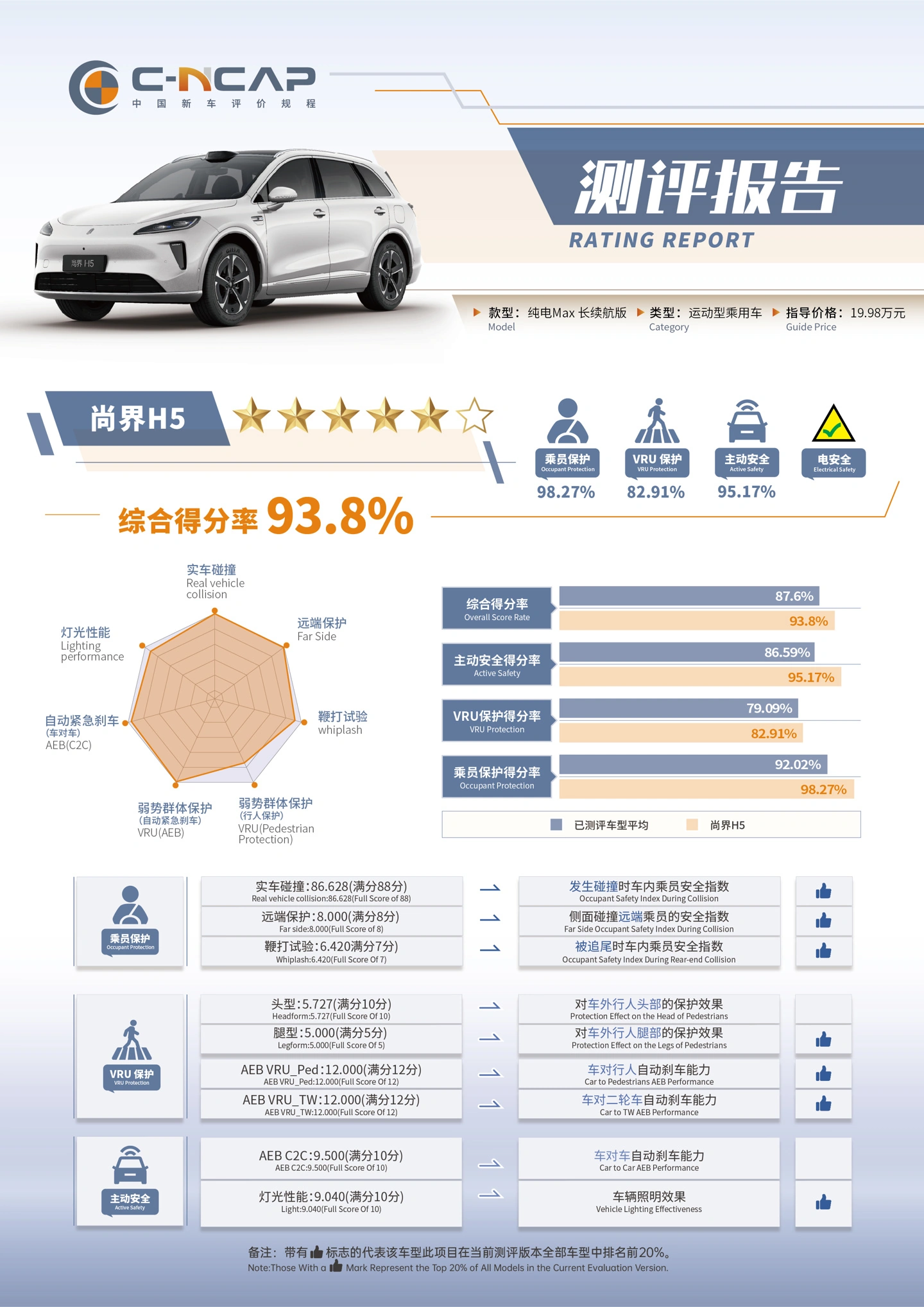 在 C-NCAP 严苛的测试标准下,尚界 H5 交出了一份近乎“满分”的答卷:乘员保护得分率 98.27%,为所有测试车型中最高成绩。VRU 保护得分率 82.91%、主动安全得分率 95.18%,三大板块均位列 20 万元以内车型前列。